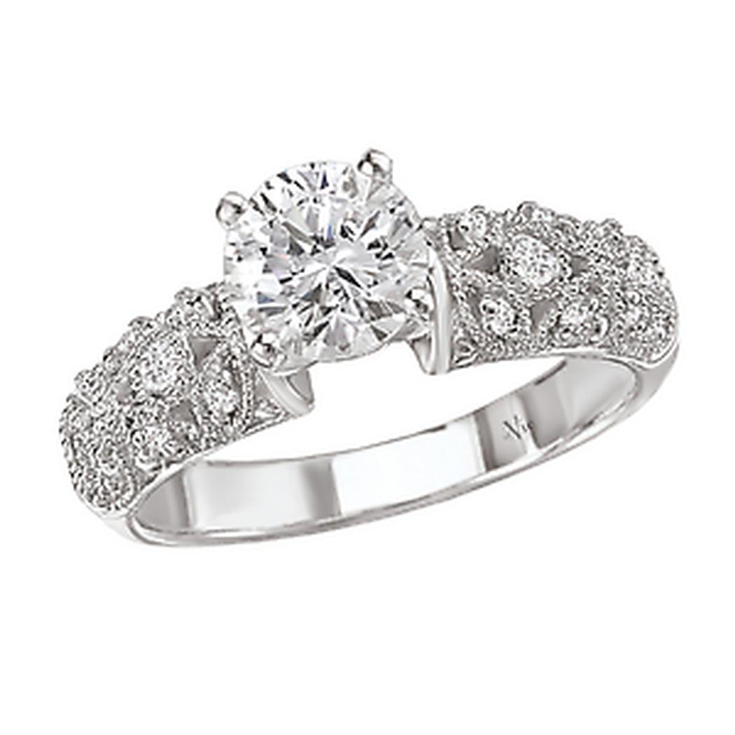 Diamond Engagement Ring in 14kt White Gold with Floral Milgrain Design. (D.1/7 carat total weight) This item is a SEMI-MOUNT and it comes with NO CENTER STONE as shown but it will accommodate a 6.5mm round center stone. Peg Head.