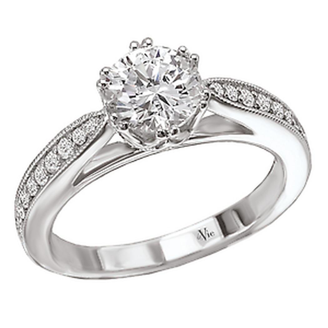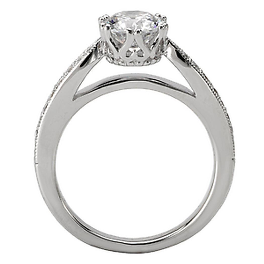 Diamond Ring in 14kt White Gold with Milgrain Detail. (D. 1/5 carat total weight)This item is a SEMI-MOUNT and it comes with NO CENTER STONE as shown but it will accommodate a 6.5mm round center stone. Crown Style Head
