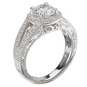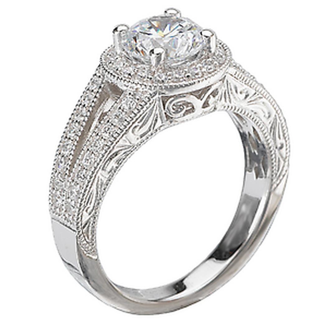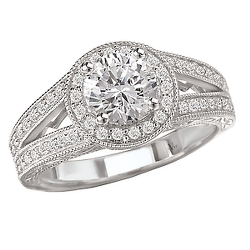 Split Shank Diamond Engagement Ring in 14kt White Gold with Milgrain Detail. (D.1/3 carat total weight) This item is a SEMI-MOUNT and it comes with NO CENTER STONE as shown but it will accommodate a 6.5mm round center stone.
