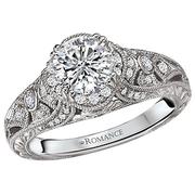 This 14K white gold semi-mount is designed to perfection with 100 round brilliant cut diamonds weighing approximately 0.45 cts. This ring drops jaws with its 100 stones mounted around a beautiful complimentary center diamond.