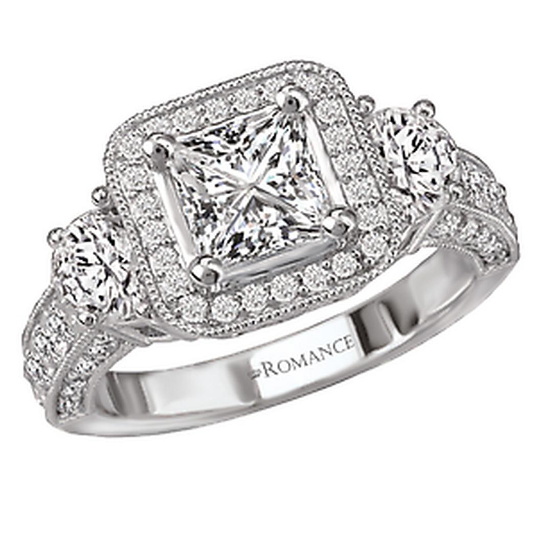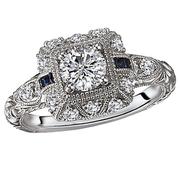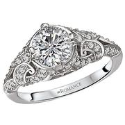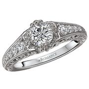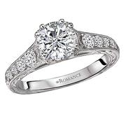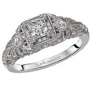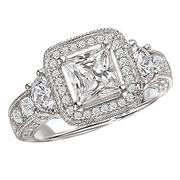 Vintage Style Diamond Ring with Round Accent Stones and Filigree Detail in 18kt White Gold. (D1 1/2 carat total weight) This item is a SEMI-MOUNT and it comes with NO CENTER STONE as shown but it will accommodate a 5.5-6mm princess cut center stone.
